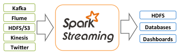 Spark Streaming是核心Spark API的扩展,可实现实时数据流的可扩展,高吞吐量,容错流处理。数据可以从许多来源(如Kafka,Flume,Kinesis或TCP套接字)中获取,并且可以使用以高级函数表示的复杂算法进行处理map,例如reduce,join和window。最后,处理后的数据可以推送到文件系统,数据库和实时仪表板。实际上,也可以在数据流上应用Spark的机器学习和图形处理算法